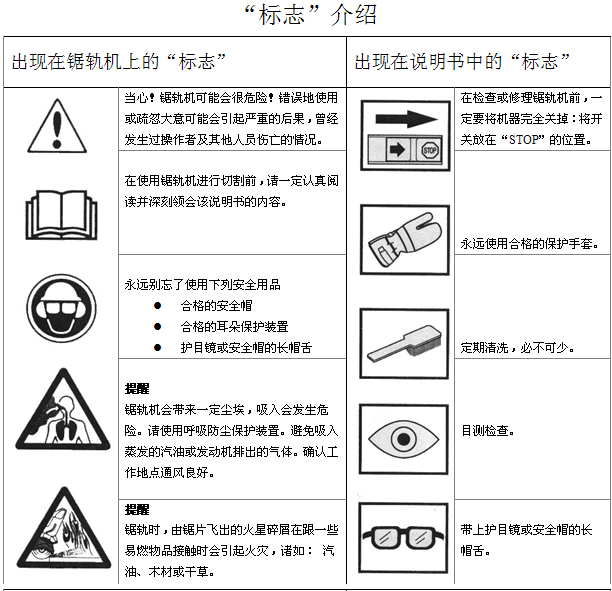 出現(xiàn)在鋸軌機(jī)及說(shuō)明書(shū)上的"標(biāo)志"解釋