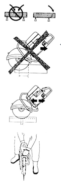 當(dāng)心!永遠(yuǎn)不用鋸片側(cè)面進(jìn)行切割;否則,可能會(huì)導(dǎo)致鋸片損壞、斷裂或產(chǎn)生嚴(yán)重的傷害。只采用鋸片刃口。